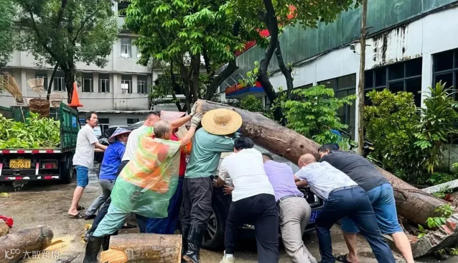 在湾仔街道,一棵白玉兰树被暴风雨吹倒,工作人员及周边居民合力将树木移走,将底下的小车成功移出。