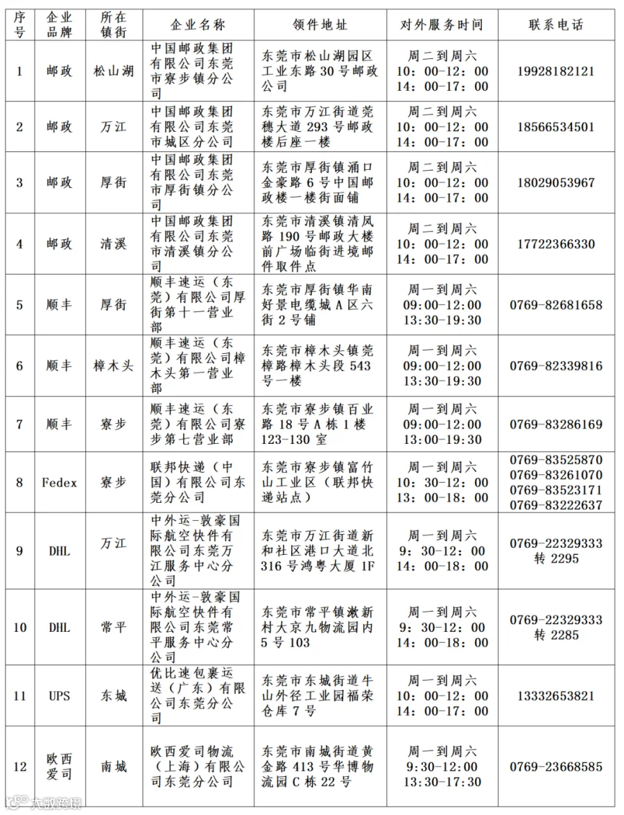 东莞市进境邮件快件集中取件点信息表
