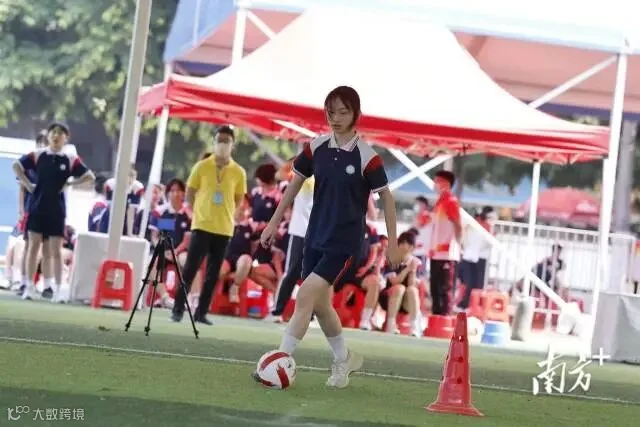 迎着阳光和微风,5月6日上午8时,广州市中考体育考试正式开考,在广州市第五中学,学生在遮阳棚下有序进行考试,在足球项目考试中,参考学生通过鼓掌的方式,互相加油鼓劲。