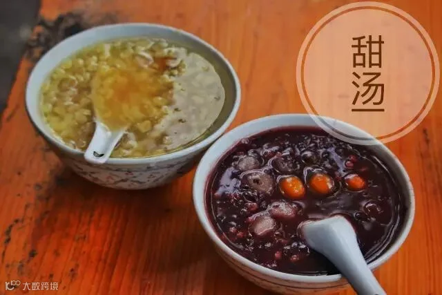 潮州的甜汤有:绿豆汤、鸭母囹、地瓜汤、薏米汤、红豆汤,八宝粥、奶香西米、银耳莲子汤、龟苓膏……下午茶来一碗甜甜的,精神一下午