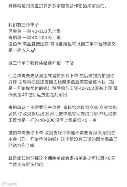 送拍单需要兼职人员下单收到货后出图给好评,商家返还兼职人员下单垫付的费用。该模式无佣金,但后续快递不需要寄回商家,商品直接送给兼职人员。