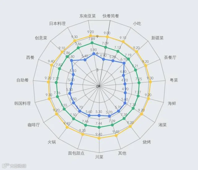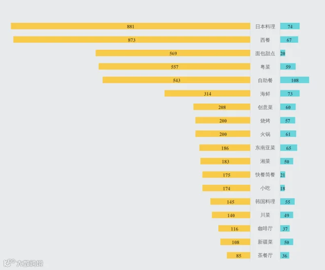 创意菜虽然各项评分都挺高的,但数量却不多,而且分布也比较零散,但可以看出他们大多选择在热门商圈的周边,1-2个地铁站的距离。所以如果是打算吃创意菜的,可得要提前找好地址信息。