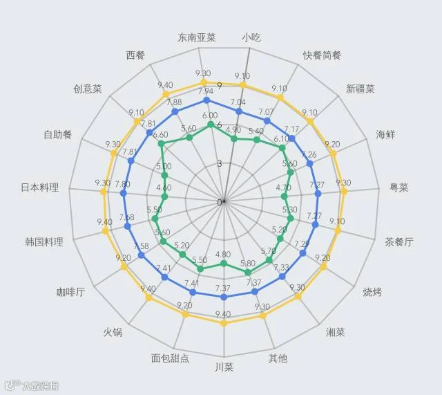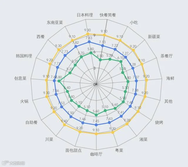 日本料理、东南亚菜、西餐、韩国料理和创意菜的口味在广州还是很受欢迎的。尤其是创意菜,最低的评分都有6.8分。