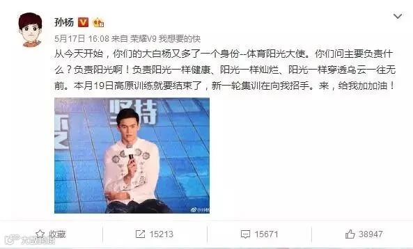 ▲负责阳光一样健康、阳光一样灿烂、阳光一样穿透乌云一往无前的体育阳光大使孙杨