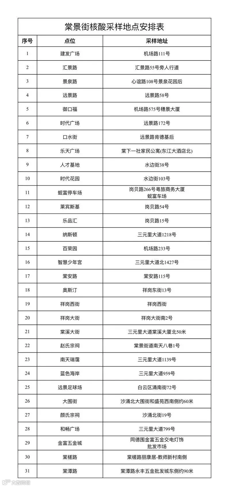 白云湖街道:广州市绿叶农产品有限公司,民信优购,黄金酱酒商店,大冈综合市场,世纪华联超市(大冈店),大森林药店(大冈店);