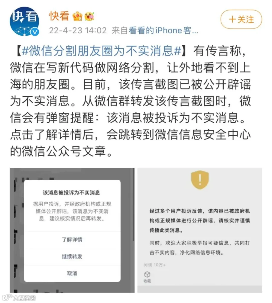 据新华社@快看 官方微博昨日(23日)消息,有传言称,微信在写新代码做网络分割,让外地看不到上海的朋友圈。目前,该传言截图已被公开辟谣为不实消息。