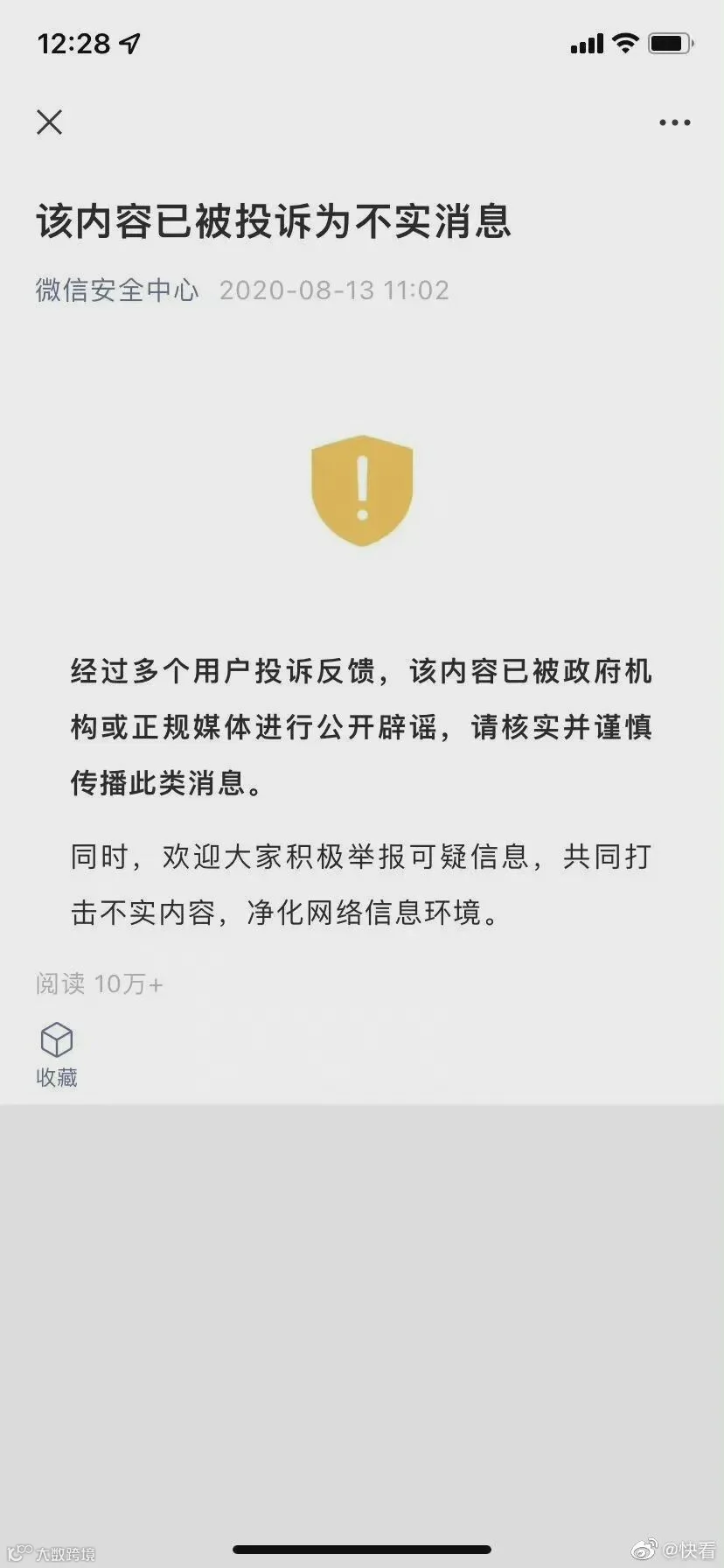 从微信群转发该传言截图时,微信会有弹窗提醒:该消息被投诉为不实消息。点击了解详情后,会跳转到微信信息安全中心的微信公众号文章。