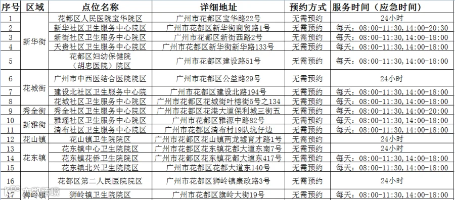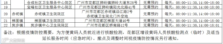 花都区“黄码”人员核酸检测服务点汇总表