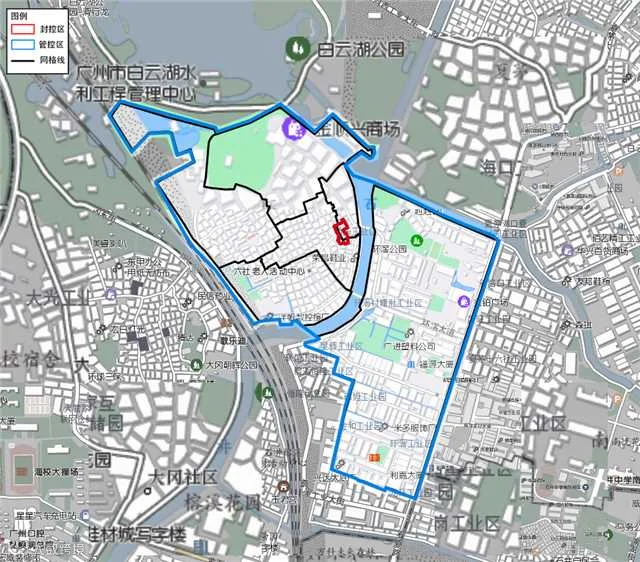 (备注:红色线标注范围为封控区域;蓝色线标注范围为管控区域;黑色线标注范围为网格化管理片区。)