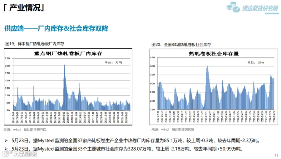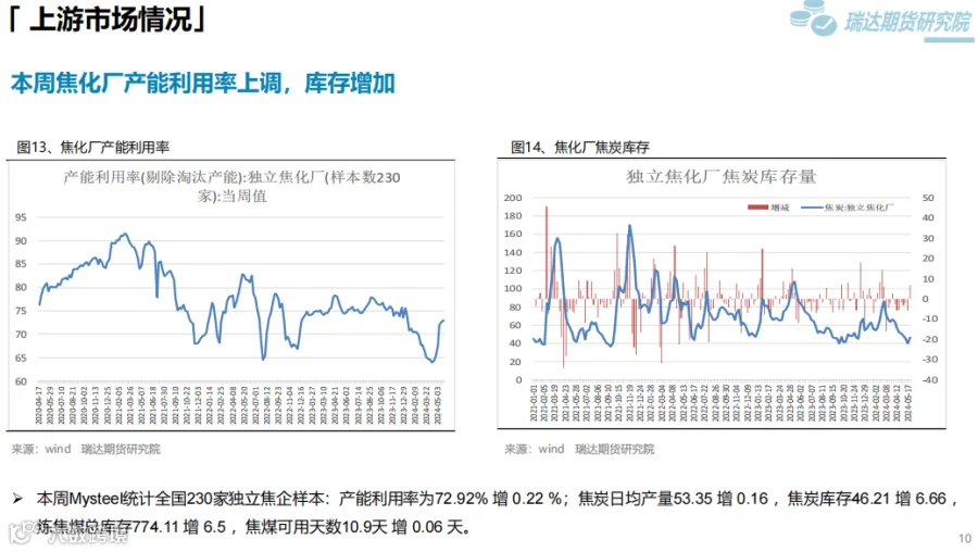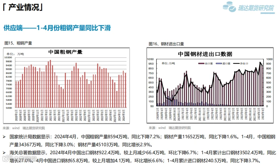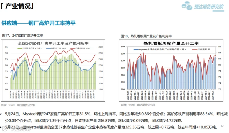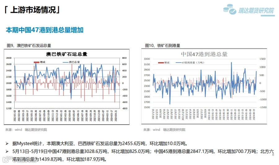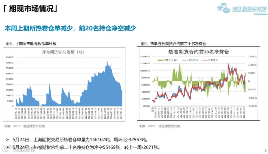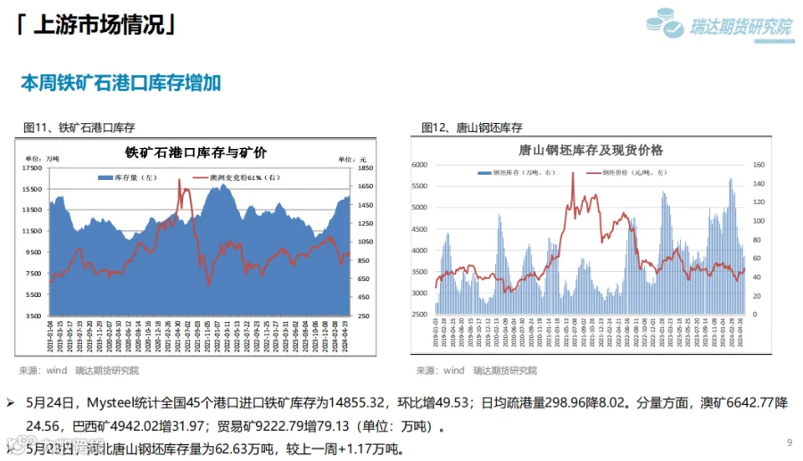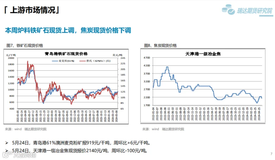 2、后市展望:供应端,本期热卷周度产量小幅提升,产能利用率维持在85%附近,现货供应相对宽松。需求端,下游基本按需采购为主,库存量小幅下滑,周度表观需求或维持在325万吨附近。最后,钢材终端利好政策对钢价仍有支撑,但股市回调叠加降息延后上行动能或减弱。