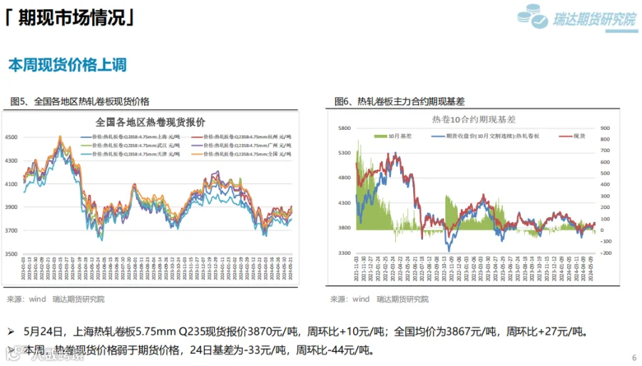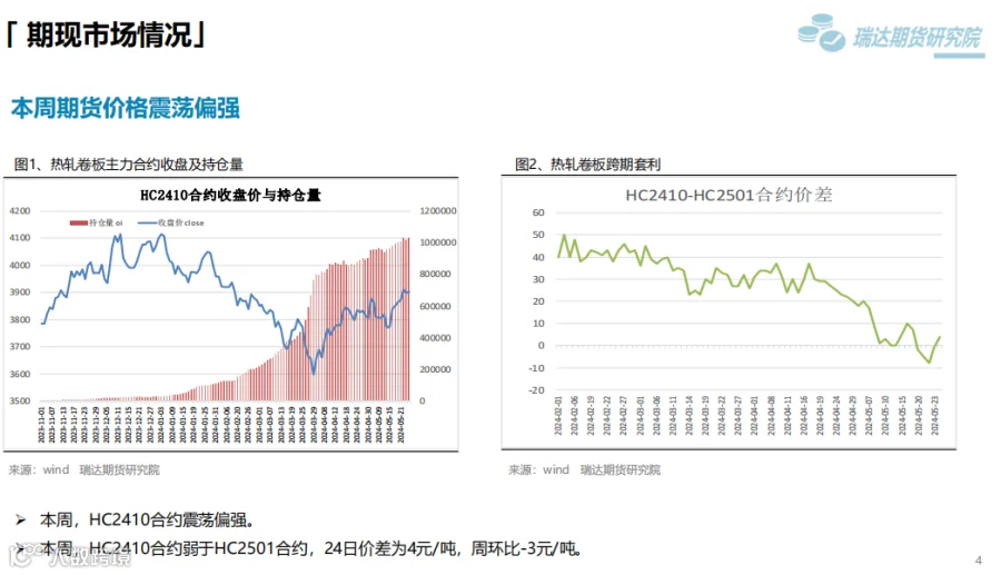 1、 本周热卷期价延续震荡偏强,重心上移。钢材终端利好政策继续提振市场信心,支撑热卷期现货价格走高,同时炉料偏强运行,炼钢成本提升,叠加4月份汽车和家电产销数据同比增加。但临近周末,热卷期价涨势放缓,一方面股市回落,另外美联储降息预期下滑大宗商品普跌。