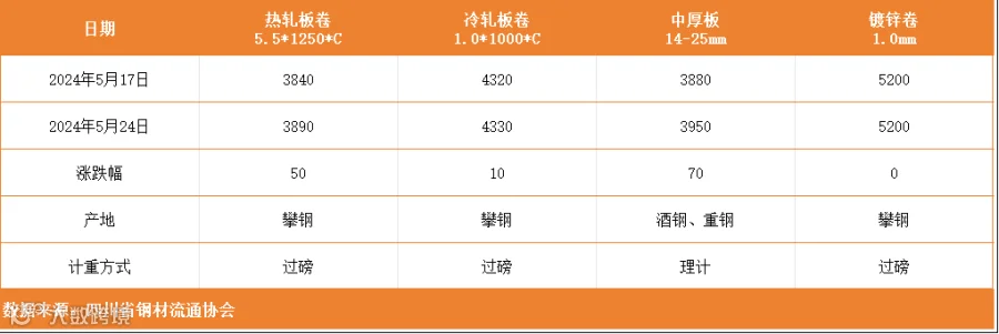 据四川省钢材流通协会对本周成都现货市场监测显示:热轧板卷较上周价格上涨50元/吨;冷轧板卷较上周价格上涨10元/吨;中厚板较上周价格上涨70元/吨;镀锌卷与上周价格相同。