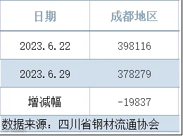 据四川省钢材流通协会统计,截止6月29日成都地区样本库房中螺纹钢及线材库存总量为378279吨,较上周减少19837吨,较去年同期减少112355吨。本期社会库存继续下滑,由于贸易商仍以降库为主。