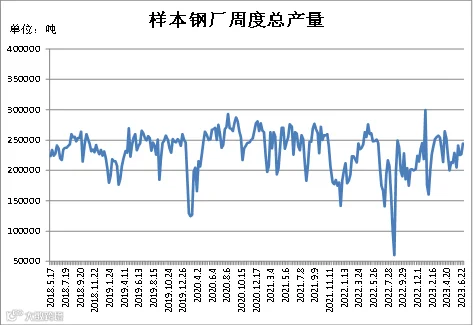 (6月23日-6月29日)四川省钢材流通协会对四家样本钢厂关于建材出厂量统计数据显示,A、B、C、D较上周分别增加3000吨、411.33吨、12000吨、2200吨。四家样本钢厂总出厂量为244000吨,周环比增加17611吨。