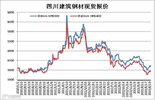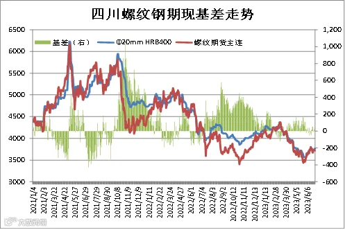 统计数据显示,成都建筑钢材现货价格与上期所螺纹钢期货价格存较强联动性,基差正常波动区间为-100-300元/吨。本期现货价格弱于期货价格,6月30日成都Φ20mmHRB400现货价为3770元/吨,RB2310合约期价为3721元/吨,基差为49元/吨,周环比-5元/吨。(备注:基差=现货-期货)