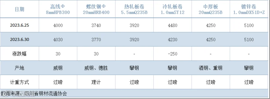 据四川省钢材流通协会对成都现货市场监测显示,本期建筑钢材价格先抑后扬,周初钢价惯性回落,但随着国内部分宏观面利好消息支撑,钢价及炉料共振上行。6月30日,成都地区Φ20mm HRB400螺纹钢价格为3770元/吨,较6月25日涨30元/吨;Φ8mm HPB300高线价格为4030元/吨,较上一周涨30元/吨。