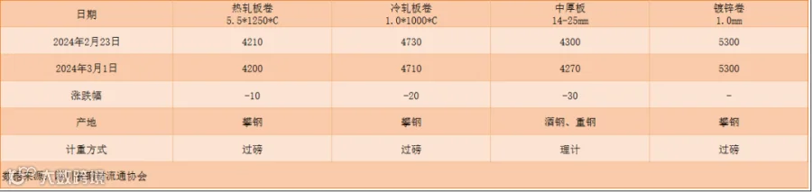 据四川省钢材流通协会对本周成都现货市场监测显示:热轧板卷较上周价格下跌10元/吨;冷轧板卷较上周价格下跌20元/吨;中厚板较上周价格下跌30元/吨;镀锌卷与上周价格相同。