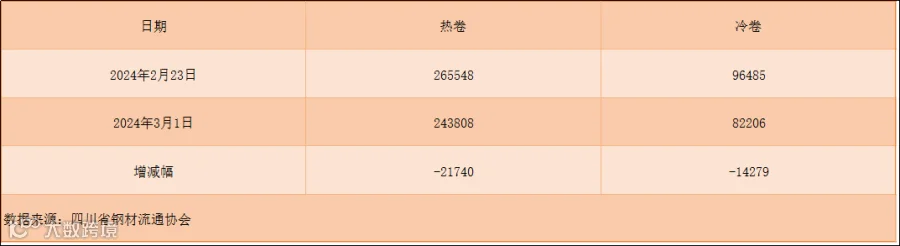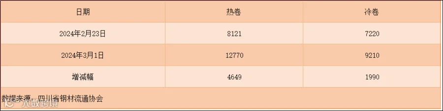 以上表单中的数据完全由川钢协信息统计部人员客观采集自相关钢厂、库房和贸易企业,川钢协力求数据及内容的准确、客观,但不能保证其完整性或准确性;本数据简报仅供浏览者参考,并不构成建议,川钢协不对该数据、简报及使用该数据和简报所导致的结果承担责任。