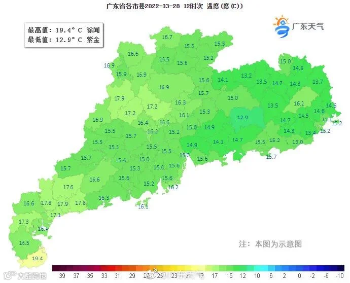 最低气温:粤北、粤东12℃~15℃,雷州半岛19℃~21℃,其余市县15℃~19℃。
