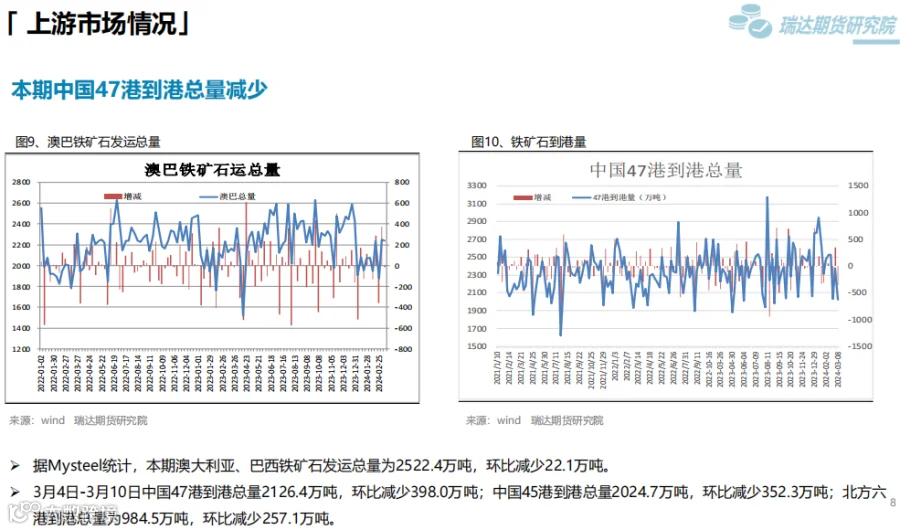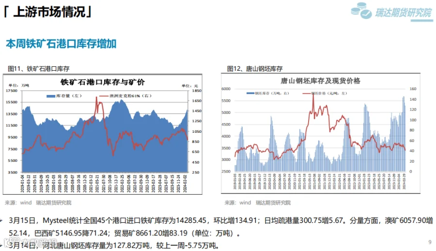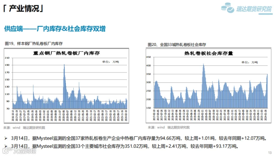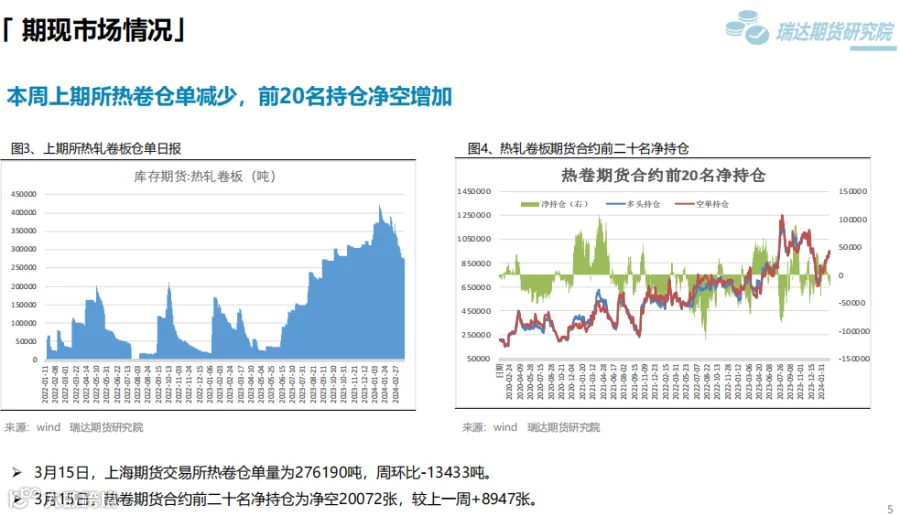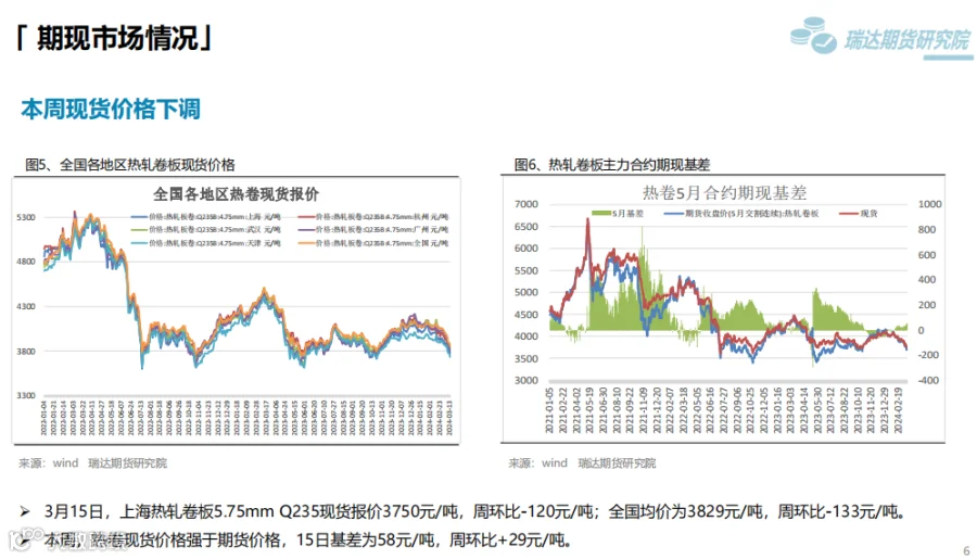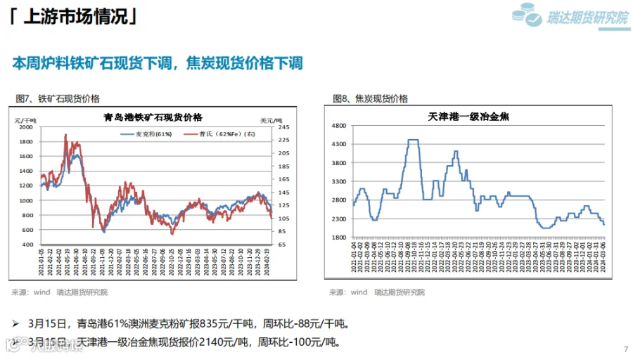 本周(3.8-3.15)热卷价格继续走弱,且跌幅扩大。由于钢价下行,挤压钢厂利润,钢厂下调焦炭及铁矿石现货采购价,其中河北地区钢厂提出对焦炭采购价格下调100-110元/吨,第五轮全面落地,炉料走弱压低炼钢成本。整体上,负反馈持续发酵黑色系产业链共振下跌。 下周(3.15-3.22)供应端、热卷周度产量继续提升,产能利用率上调至81%,由于建筑钢材低迷,钢厂将更多铁水向板材转移。需求端,下游复产增多,采购量有所增加,但力度相对有限,库存量延续小幅提升。最后,关注宏观面对市场情绪影响。