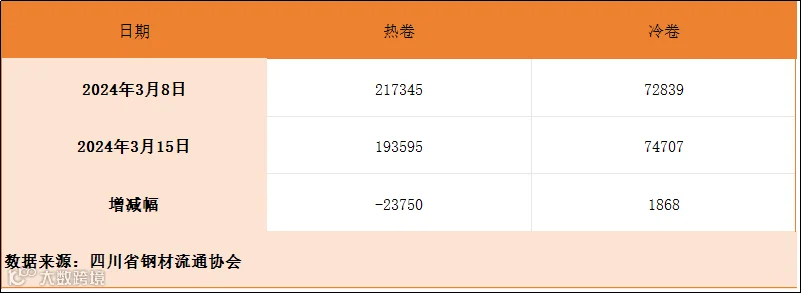 据四川省钢材流通协会统计,本周成都地区样本库房中热卷库存量为193595吨,较上周减少23750吨。冷卷库存量为74707吨,较上周增加1868吨。