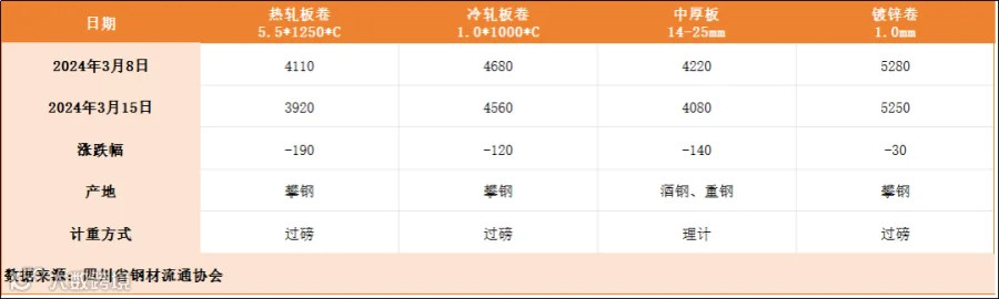 表一:本周四川市场部分板材价格变化汇总(单位:元/吨)