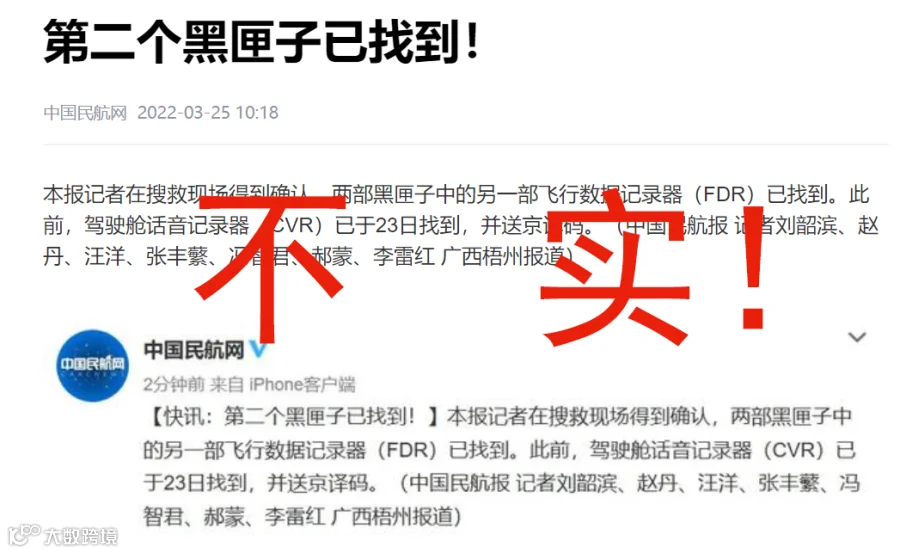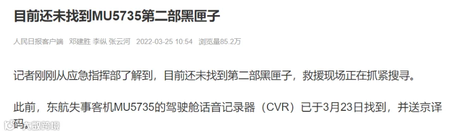 3月25日上午,网络流传MU5735第二部黑匣子已找到。后据人民日报客户端发布消息称:“记者刚刚从应急指挥部了解到,目前还未找到第二部黑匣子,救援现场正在抓紧搜寻。”
