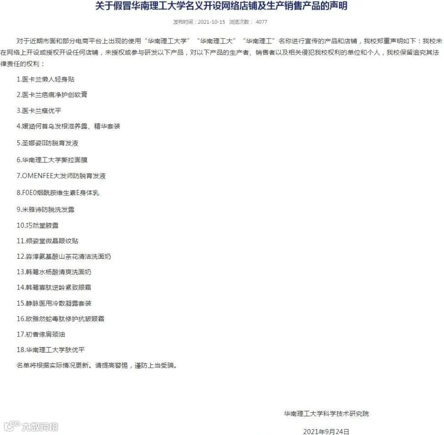 对于近期市面和部分电商平台上出现的使用“华南理工大学”“华南理工大”“华南理工”名称进行宣传的产品和店铺,