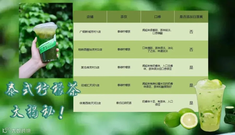而在暗访中编号为“芳村3店”的,店员透露,泰式柠檬茶的颜色之所以这绿,全是原料中的“泰国绿茶”泡出来的,不用添加其他成分。当记者询问,泰国绿茶中是否添加色素等成分?店员表示不置可否。不过随后的送检结果揭开了谜底。在这家芳村3店购买的一杯泰绿柠檬茶,日落黄含量为35.798mg/kg。