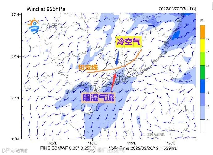 傍晚前后全省气温分布:粤北偏北市县12~16℃,粤北偏南市县和珠江三角洲北部市县17~20℃,粤西、粤东和珠江口两侧市县26~29℃,其余市县23~27℃。