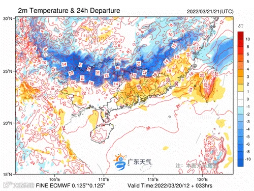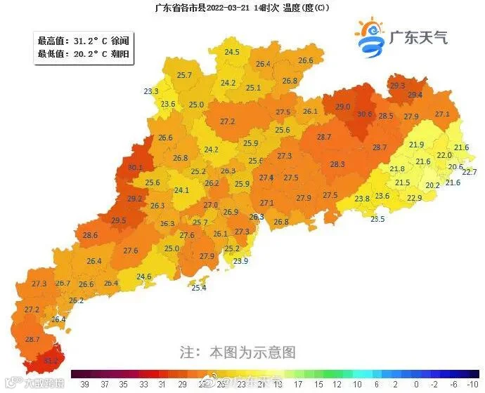 早晨最低气温:粤北10~14℃(高海拔山区6~9℃),珠江三角洲和粤东市县15~18℃,其余市县18~21℃,昼夜温差小。