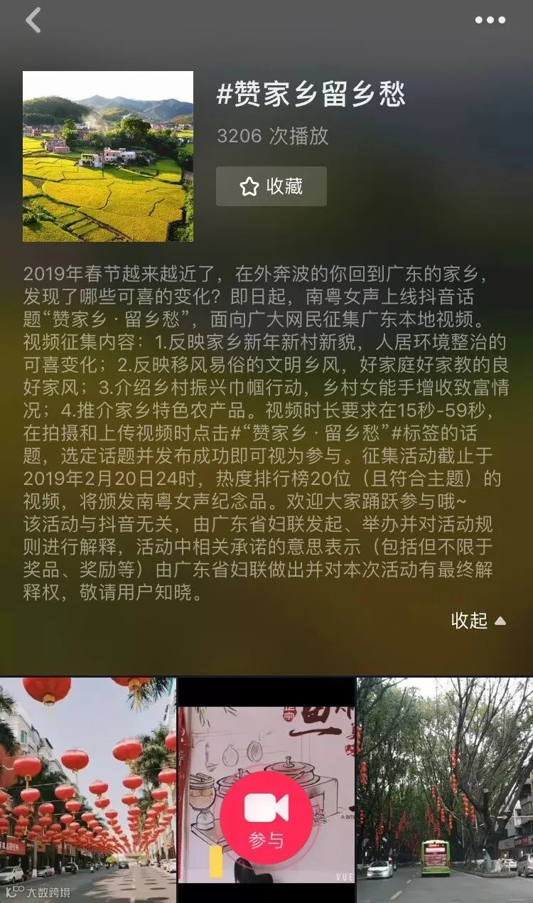 方式二:登陆抖音短视频app,在拍摄和上传视频时点击#赞家乡留乡愁标签的话题,选定话题并发布成功即可视为参与。