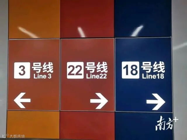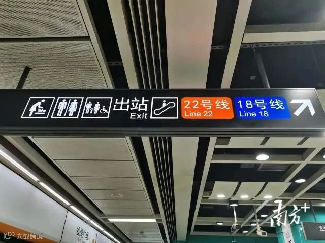 从3号线列车下车后,抬头即可看到前往18号线、22号线的指示牌。搭乘扶梯向上到达站厅,厅内设有“看千年广州”历史文化展,120多幅历史地图和湾区蓝、活力橙、亮丽黄三色组成的指示标识交映。