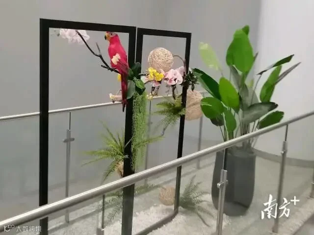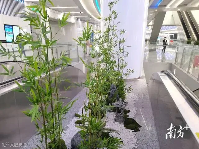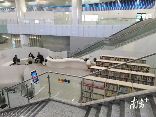 番禺广场站空间开阔,色调简约大气,充满设计感和线条感,却不显冷硬。站厅设有书吧,原木书架,线型长椅,长桌上放置台灯和盆栽,供乘客小坐放松身心。扶梯之间的狭窄平台摆放着绿植、花鸟摆件,清新亮眼,给现代感的空间增添了一丝自然生机。