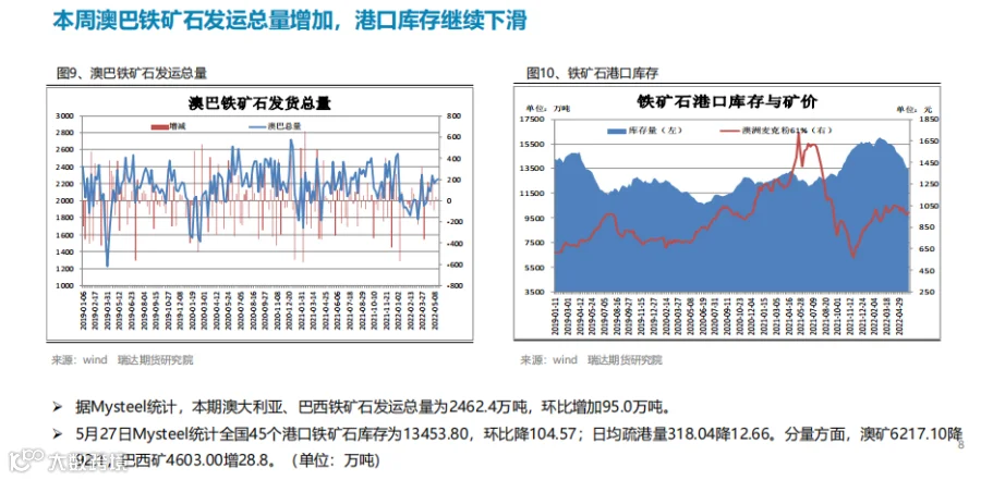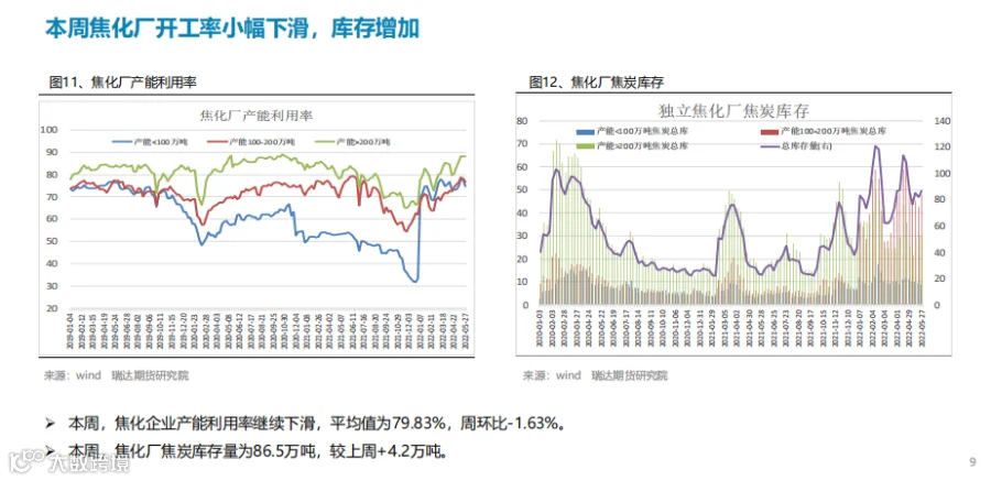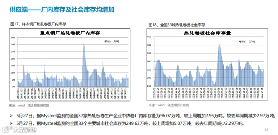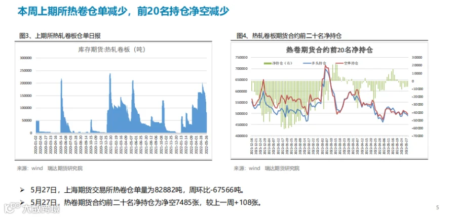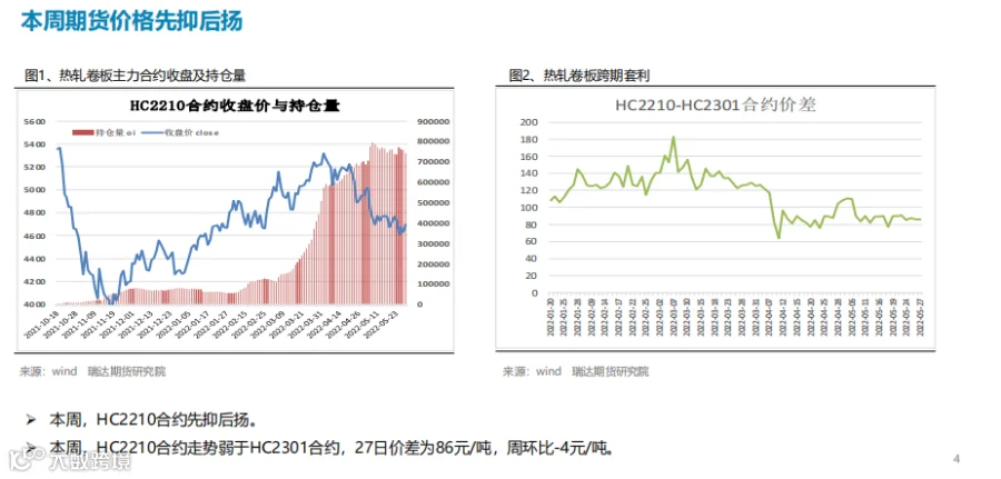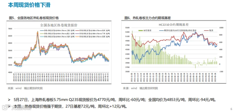本周(5.20-5.27)热轧卷板价格先抑后扬。周初由于终端需求表现不佳,而焦炭调降预期打压市场情绪,现货市场基本处于观望状态,不急于拿货,贸易商以回笼资金为主,期现货价格同步下行。进入下半周,随着稳增长政策频出,国常会要求,进一步部署稳经济一揽子措施,努力推动经济回归正常轨道,确保运行在合理区间,另外央行部署加大信贷投放力度。市场情绪获得提振,期价止跌反弹。下周(5.27-6.3)热卷价格或延续宽幅震荡。供应端,热卷周度产量继续下滑,但产能利用率仍维持在80%上方, 主要降幅地区是华东地区,由于钢厂上周开始检修、但检修天数较少。需求端,下游需求表现一般,热卷厂内库存及社会库存均出现回升,同比降幅则继续收窄。最后,宏观政策利好是最大支撑点,25 日国务院召开会议并确立当前稳经济的决心,同时发布盘活存量资产的意见,叠加汽车下乡政策也将一定程度上提振市场情绪。