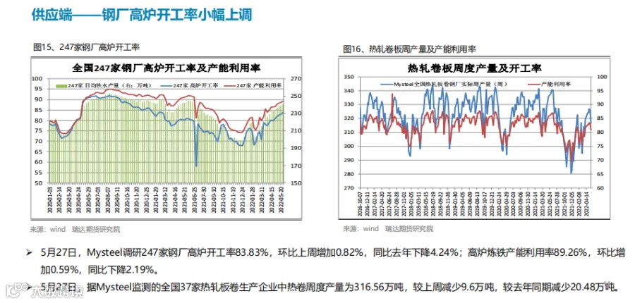 ▋ Mysteel调研247家钢厂高炉开工率83.83%,环比上周增加0.82%,同比去年下降4.24%;高炉炼铁产能利用率89.26%,环比增加0.59%,同比下降2.19%;钢厂盈利率48.48%,环比下降8.23%,同比下降36.80%;日均铁水产量240.88万吨,环比增加1.34万吨,同比下降3.43万吨。