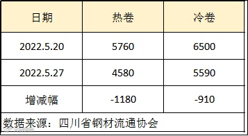本周四川省钢材流通协会对样本钢厂关于板材出货量统计数据显示,热卷出货量4580吨,较上周减少1180吨。冷卷出货量5590吨,较上周减少910吨。