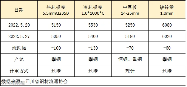 据四川省钢材流通协会对本周成都现货市场监测显示;热轧板卷较上周价格下跌100元/吨;冷轧板卷较上周价格下跌130元/吨;中厚板价格较上周下跌70元/吨,镀锌卷价格较上周价格下跌60元/吨。
