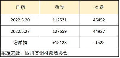 据四川省钢材流通协会统计,本周成都地区样本库房中热卷库存量为127659吨,较上周增加15128吨。冷卷库存量为44927吨,较上周减少1525吨。