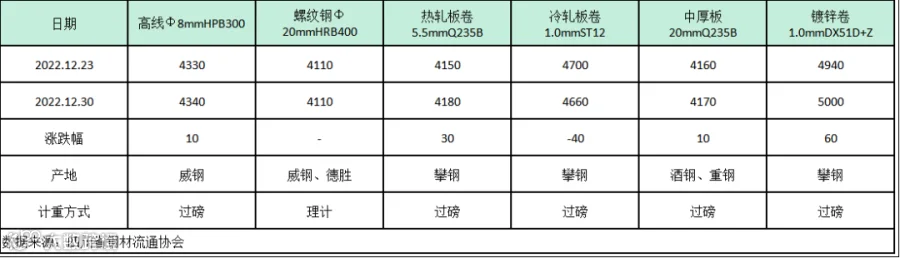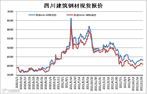 据四川省钢材流通协会对成都现货市场监测显示,本期建筑钢材价格高位整理,终端需求继续萎缩,但未来需求预期回升,期螺走高提振市场信心。12月30日,成都地区Φ20mm HRB400螺纹钢价格为4110元/吨,较12月23日持平;Φ8mm HPB300高线价格为4340元/吨,涨10元/吨。