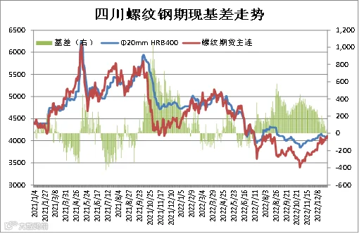统计数据显示,成都建筑钢材现货价格与上期所螺纹钢期货价格存较强联动性,基差正常波动区间为-100-300元/吨。本周现货价格弱于期货,12月30日成都Φ20mmHRB400现货价为4110元/吨,RB2305合约期价为4105元/吨,基差为5元/吨,周环比-100元/吨。