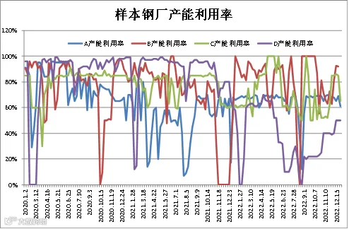 (12.23—12.30)四川省钢材流通协会对四家样本钢厂关于建材产能利用率统计数据显示,A、B、C较上周分别下调8%、0.59%、20%;D持平。