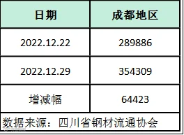 据四川省钢材流通协会统计,截至12月29日,成都地区样本库房中螺纹钢及线材库存总量为354309吨,较上周增加64423吨,较去年同期增加42367吨。本期社会库存量继续增加,且增幅扩大,由于终端需求进一步缩小。