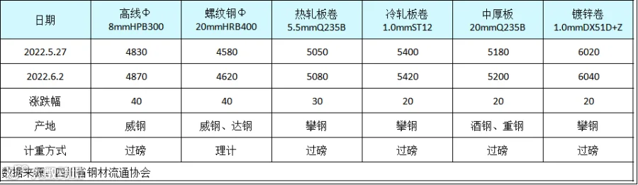 据四川省钢材流通协会对成都现货市场监测显示,本期建筑钢材价格止跌反弹,由于近期稳增长政策频出,叠加节前下游补库,提振市场多头情绪。6月2日,成都地区Φ20mm HRB400螺纹钢价格为4620元/吨,较5月27日涨40元/吨;Φ8mm HPB300高线价格为4870元/吨,涨40元/吨。
