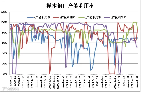 (5月27日-6月1日)四川省钢材流通协会对四家样本钢厂关于建材产能利用率统计数据显示,A、B较上周增加3%、21.13%;C较上周减少13%;D较上周持平。