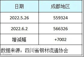 据四川省钢材流通协会统计,截止6月2日成都地区样本库房中螺纹钢及线材库存总量为566326吨,较上周增加7002吨,较去年同期增加161676吨。本期社会库存量继续增加,且高于去年同期,由于省外资源到货增加,雨水天气亦影响终端需求。