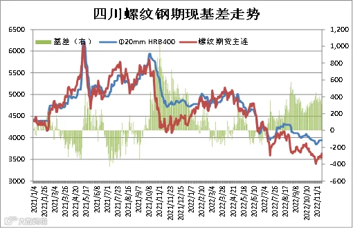 统计数据显示,成都建筑钢材现货价格与上期所螺纹钢期货价格存较强联动性,基差正常波动区间为-100-300元/吨。本周现货价格弱于期货,11月11日成都Φ20mmHRB400现货价为3950元/吨,RB2301合约期价为3637元/吨,基差为313元/吨,周环比-25元/吨。(备注:基差=现货-期货)