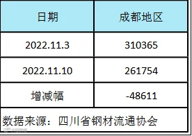 据四川省钢材流通协会统计,截止11月11日成都地区样本库房中螺纹钢及线材库存总量为261754吨,较上周减少48611吨,较去年同期减少203864吨。本期社会库存量继续下滑,因省外到货资源较少,同时终端需求增加。