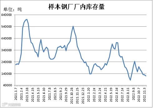 据四川省钢材流通协会对四家样本钢厂关于建材厂内库存统计数据显示,截止11月11日,A、B较上周分别减少2000吨、11876.01吨;D较上周增加4600吨;C则持平。四家样本钢厂厂内总库存量为120420吨,周环比减少9276吨。