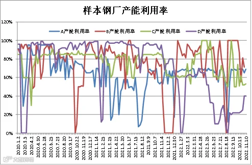 (11月4日-11月11日)四川省钢材流通协会对四家样本钢厂关于建材产能利用率统计数据显示,A、C较上周分别提升4%、1%;B较上周下降9.76%;D持平。